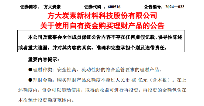 5月10日晚间,方大炭素(600516)披露公告称,公司及控股子公司拟使用自有资金购买安全性高、流动性好的理财产品。自股东大会审议通过之日起12个月内,购买理财产品额度不超过40亿元。