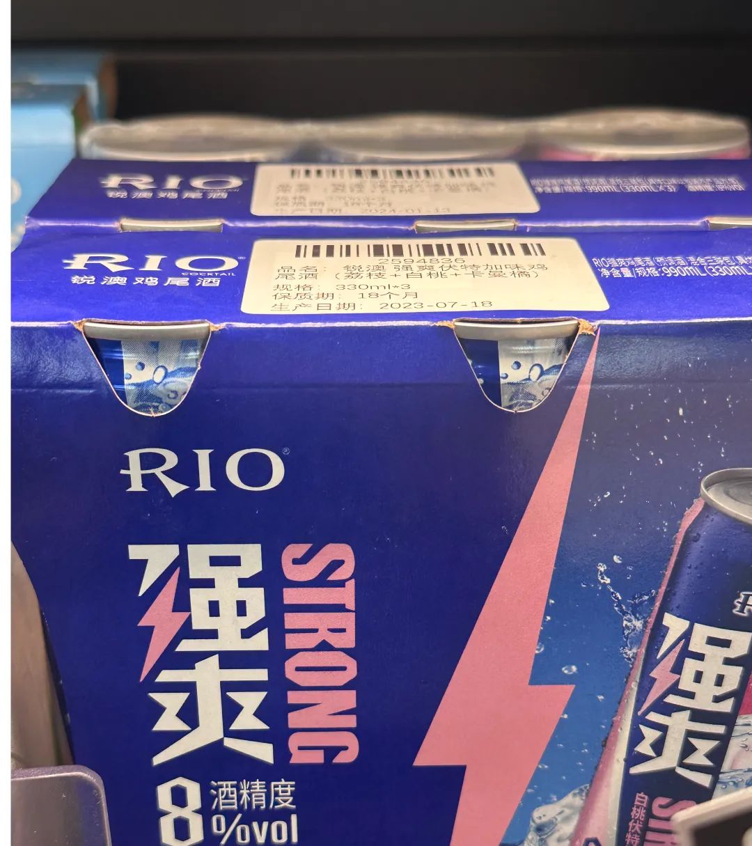 记者近日走访上海一家盒马超市,鸡尾酒展示区共3排货架,锐澳一个品牌就占了一半的展示位。其中,单罐售卖的RIO强爽生产日期多在2024年,但3罐组合装也出现生产日期在2023年7月的情况(生产已9个月有余)。