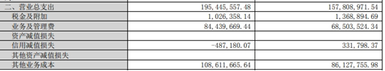 财联社注意到,在营业总支出一栏里,业务及管理费支出高达8.4千万,远超手续费及利息收入,其他业务成本则也高达1.08亿元。为此财联社去电董秘办公室后,对方表示电话中不方便回应。