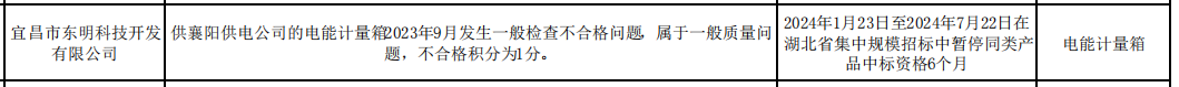公告显示,宜昌市东明科技开发有限公司,在供襄阳供电公司的电能计量箱2023年9月发生一般检查不合格问题,属于一般质量问 题,不合格积分为1分。