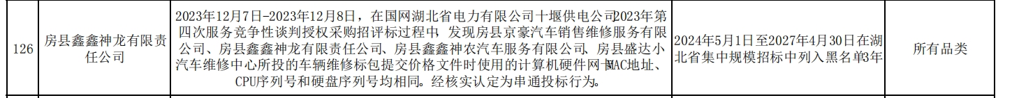 其中,房县鑫鑫神农汽车服务有限公司在2023年12月7日至2023年12月8日的国网湖北省电力有限公司十堰供电公司2023年第四次服务竞争性谈判授权采购招评标过程中,被发现与房县京豪汽车销售维修服务有限公司、房县鑫鑫神龙有限责任公司、房县盛达小汽车维修中心所投的车辆维修标包提交价格文件时使用的计算机硬件网卡MAC地址、CPU序列号和硬盘序列号均相同。经核实认定为串通投标行为。处理措施:2024年5月1日至2027年4月30日在湖北省集中规模招标中列入黑名单3年。处理范围:所有品类。