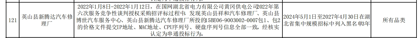 其中,英山县新腾达汽车修理厂在2022年1月8日至2022年1月12日的国网湖北省电力有限公司黄冈供电公司2022年第六次服务竞争性谈判授权采购招评标过程中,被发现与英山县祥和汽车修理厂、英山县博世汽车服务中心所投的15BE06-9003002-0007包1、包2的价格文件提交IP地址、MAC地址、CPU序列号、硬盘序列号信息全部一致。经核实认定为串通投标行为。处理措施:2024年5月1日至2027年4月30日在湖北省集中规模招标中列入黑名单3年。处理范围:所有品类。