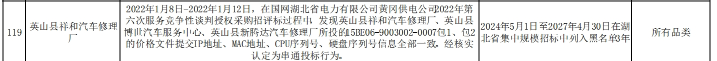 其中,英山县祥和汽车修理厂在2022年1月8日至2022年1月12日的国网湖北省电力有限公司黄冈供电公司2022年第六次服务竞争性谈判授权采购招评标过程中,被发现与英山县博世汽车服务中心、英山县新腾达汽车修理厂所投的15BE06-9003002-0007包1、包2的价格文件提交IP地址、MAC地址、CPU序列号、硬盘序列号信息全部一致。经核实认定为串通投标行为。处理措施:2024年5月1日至2027年4月30日在湖北省集中规模招标中列入黑名单3年。处理范围:所有品类。
