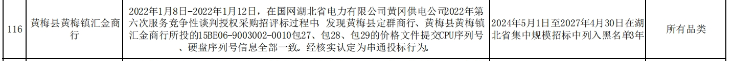 其中,黄梅县黄梅镇汇金商行在2022年1月8日至2022年1月12日的国网湖北省电力有限公司黄冈供电公司2022年第六次服务竞争性谈判授权采购招评标过程中,被发现与黄梅县定群商行所投的15BE06-9003002-0010包27、包28、包29的价格文件提交CPU序列号、硬盘序列号信息全部一致。经核实认定为串通投标行为。处理措施:2024年5月1日至2027年4月30日在湖北省集中规模招标中列入黑名单3年。处理范围:所有品类。