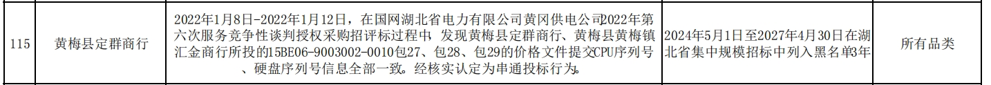 其中,黄梅县定群商行在2022年1月8日至2022年1月12日的国网湖北省电力有限公司黄冈供电公司2022年第六次服务竞争性谈判授权采购招评标过程中,被发现与黄梅县黄梅镇汇金商行所投的15BE06-9003002-0010包27、包28、包29的价格文件提交CPU序列号、硬盘序列号信息全部一致。经核实认定为串通投标行为。处理措施:2024年5月1日至2027年4月30日在湖北省集中规模招标中列入黑名单3年。处理范围:所有品类。