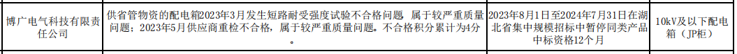 公告显示,博广电气科技有限责任公司,在供省管物资的配电箱2023年3月发生短路耐受强度试验不合格问题,属于较严重质量问题;2023年5月供应商重检不合格,属于较严重质量问题。不合格积分累计为4分 。