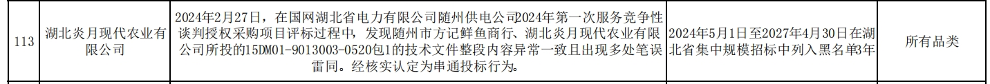其中,湖北炎月现代农业有限公司在2024年2月27日的国网湖北省电力有限公司随州供电公司2024年第一次服务竞争性谈判授权采购项目评标过程中,被发现与随州市方记鲜鱼商行所投的15DM01-9013003-0520包1的技术文件整段内容异常一致且出现多处笔误雷同。经核实认定为串通投标行为。处理措施:2024年5月1日至2027年4月30日在湖北省集中规模招标中列入黑名单3年。处理范围:所有品类。
