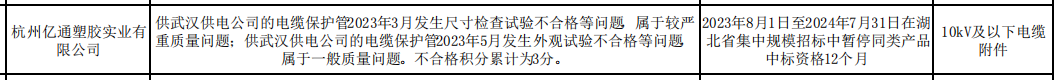 公告显示,杭州亿通塑胶实业有限公司,在供武汉供电公司的电缆保护管2023年3月发生尺寸检查试验不合格等问题,属于较严重质量问题;供武汉供电公司的电缆保护管2023年5月发生外观试验不合格等问题, 属于一般质量问题。不合格积分累计为3分。