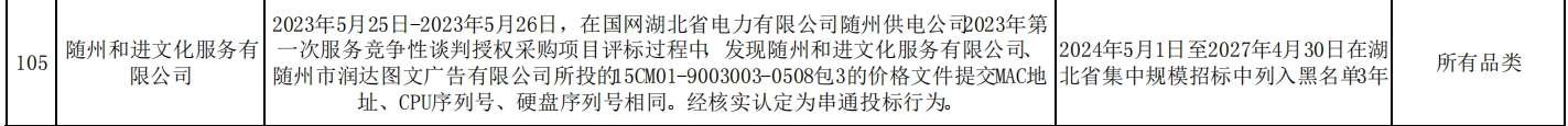 其中,随州和进文化服务有限公司在2023年5月25日至2023年5月26日的国网湖北省电力有限公司随州供电公司2023年第一次服务竞争性谈判授权采购项目评标过程中,被发现与随州市润达图文广告有限公司所投的15CM01-9003003-0508包3的价格文件提交MAC地址、CPU序列号、硬盘序列号相同。经核实认定为串通投标行为。处理措施:2024年5月1日至2027年4月30日在湖北省集中规模招标中列入黑名单3年。处理范围:所有品类。