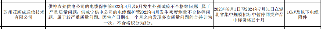 公告显示,苏州茂顺成通信技术有限公司,在供神农架供电公司的电缆保护管2023年4月及5月发生外观试验不合格等问题,属于严重质量问题;供咸宁供电公司的电缆保护管2023年4月发生密度测量不合格等问题,属于较严重质量问题。因生产日期在一个月之内发现多次质量问题的合并计为一次,不合格积分为3分。