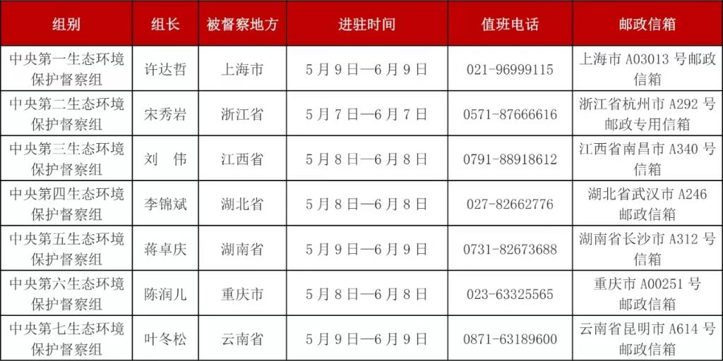 据悉,7个督察组将分别对上海、浙江、江西、湖北、湖南、重庆、云南7个省(市)开展为期约1个月的督察进驻工作。进驻期间,各督察组分别设立专门值班电话和邮政信箱,受理被督察地方生态环境保护方面的来信来电信访举报,受理举报电话时间为每天8:00至20:00。