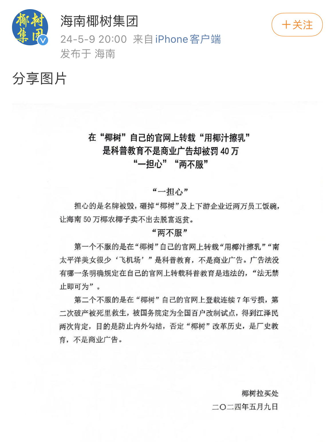 5月9日晚8点,海南椰树集团在其官方微博和网站分别发布声明,针对其近期因广告含有妨碍社会公共秩序和违背社会良好风尚的内容和情形,被海口市市场监督管理局龙华分局罚款40万元的事件,表示了“担心”和“不服”。