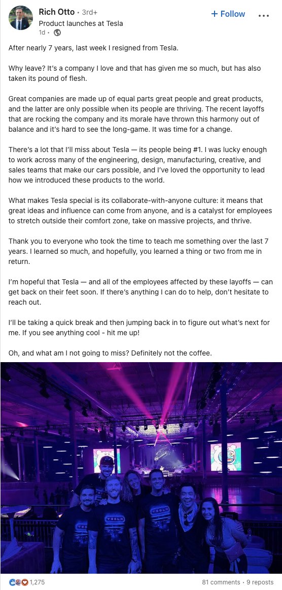 毫无疑问,从Otto发布的声明看,特斯拉今年大面积裁员的决定,是导致其最终决定离开特斯拉的主要原因。