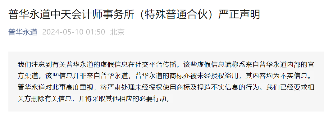 普华永道进而表示,已经就该信的发布和传播向有关执法部门报案,并保留追究捏造、散布和传播不实信息者的法律责任的权利。