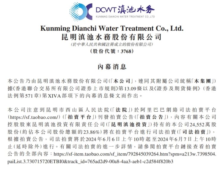 5月9日晚间,滇池水务(03768.HK)发布公告,公司注意到昆明市西山区人民法院于阿里巴巴网络司法拍卖平台刊发拍卖公告,内容有关公司控股股东昆明滇池投资有限责任公司持有的公司2.46亿股股份(约占公司股份总额的23.86%)将在拍卖平台进行司法拍卖,根据拍卖公告,司法拍卖将于2024年6月6日上午10时起至2024年6月7日上午10时止(延时除外)进行。