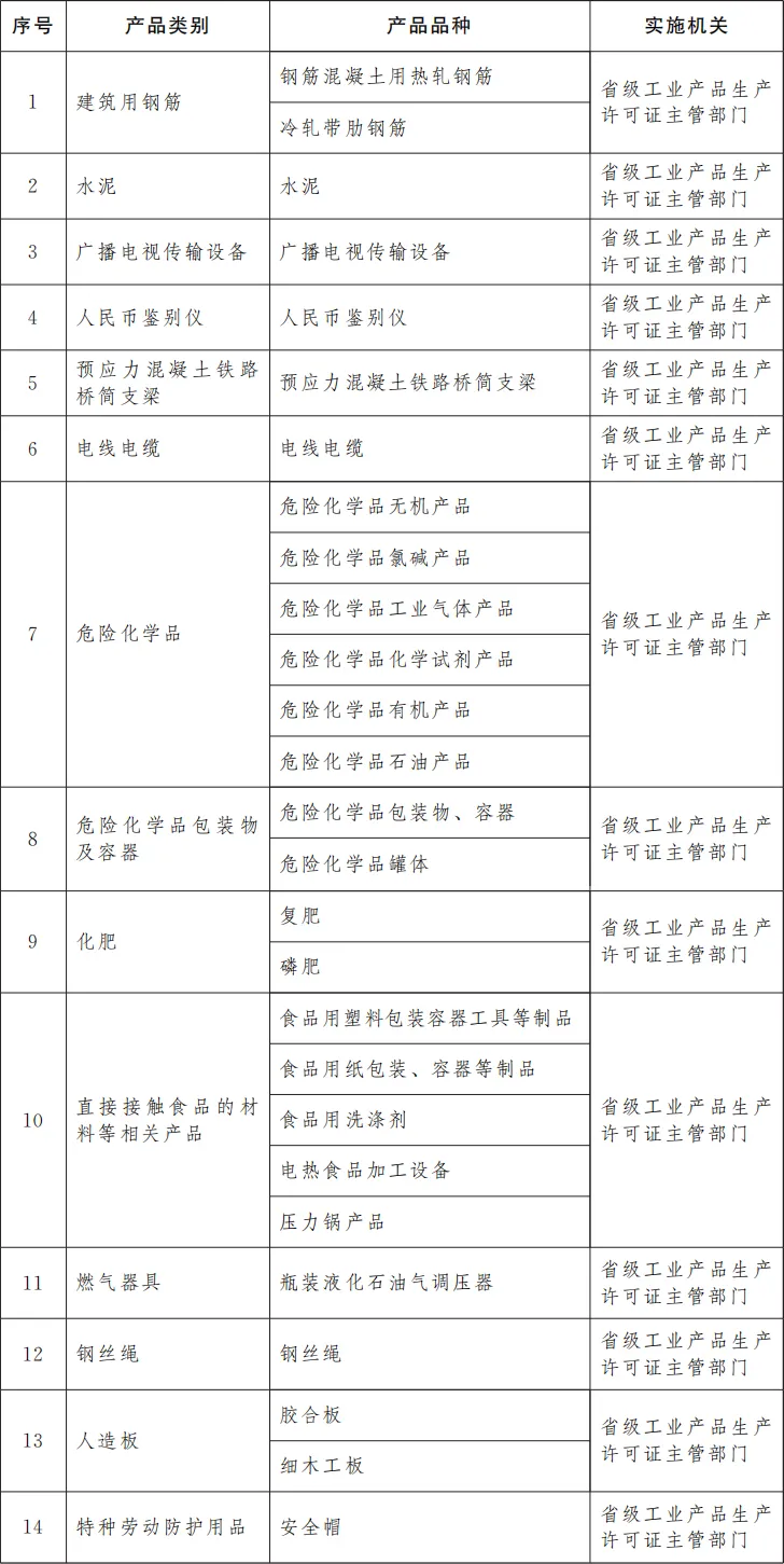 为保障重要工业产品质量安全,强化产品准入管理和源头治理,防范产品质量安全重大风险,确保人民群众生命财产安全和公共安全,国务院决定,调整完善工业产品生产许可证管理目录,对冷轧带肋钢筋、瓶装液化石油气调压器、钢丝绳、胶合板、细木工板、安全帽等6种产品实施工业产品生产许可证管理。调整后,实施工业产品生产许可证管理的产品共计14类27个品种,由省级工业产品生产许可证主管部门负责实施,相关审批权限不得下放。同时,化肥生产许可证审批方式由告知承诺调整为“先核后证”审批。