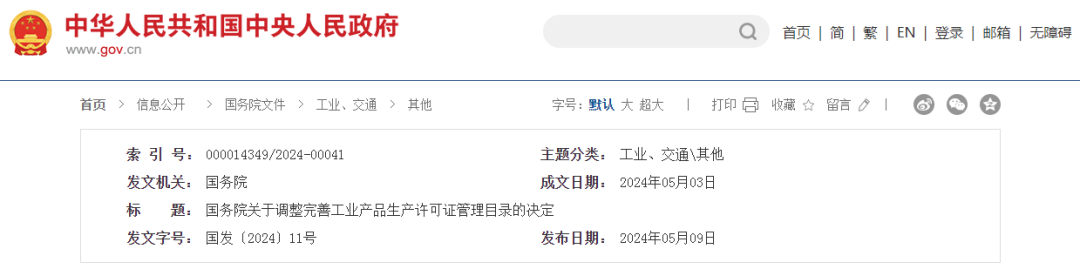 5月9日,国务院发布《关于调整完善工业产品生产许可证管理目录的决定》。其中指出,为保障重要工业产品质量安全,强化产品准入管理和源头治理,防范产品质量安全重大风险,确保人民群众生命财产安全和公共安全,国务院决定,调整完善工业产品生产许可证管理目录,对冷轧带肋钢筋、瓶装液化石油气调压器、钢丝绳、胶合板、细木工板、安全帽等6种产品实施工业产品生产许可证管理。调整后,实施工业产品生产许可证管理的产品共计14类27个品种,由省级工业产品生产许可证主管部门负责实施,相关审批权限不得下放。同时,化肥生产许可证审批方式由告知承诺调整为“先核后证”审批。