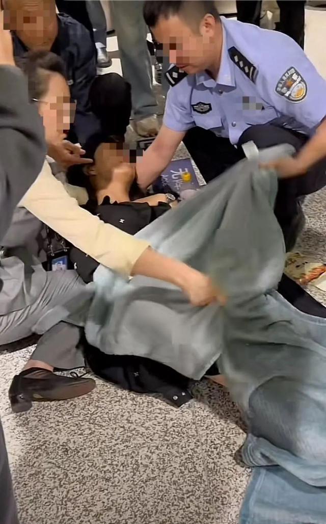 另几段视频显示,在旅客喊话后,有工作人员出面进行沟通。一名女性旅客倒在地上,有派出所工作人员和机场工作人员在处置,为旅客盖毯子……