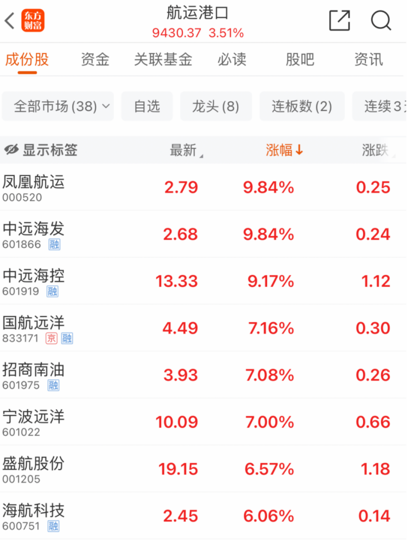 受此影响,A股航运板块大爆发,凤凰航运、中远海发涨停,号称“周期之王”的中远海控大涨超9%,股价创2022年3月以来新高。此外,国航远洋、招商南油、宁波远洋、盛航股份、海航科技等个股亦集体大涨。