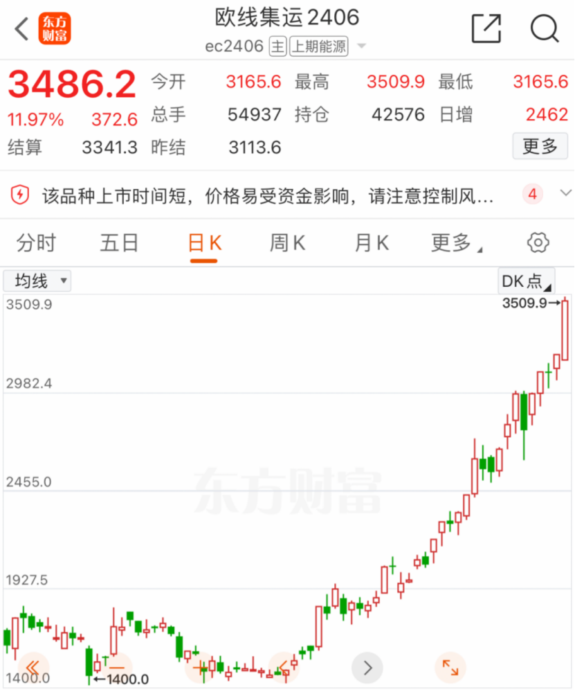 今日,强势的集运指数(欧线)主力合约突然大爆发,盘中一度暴涨超12%,最高报3509.9,刷新历史最高纪录,截至收盘,涨幅仍高达11.97%,收报3486.2。