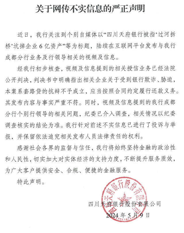 5月9日,四川天府银行发布声明称,近日关注到个别自媒体以“四川天府银行被指‘过河拆桥’坑掉企业6亿资产”等为标题,陆续在互联网平台发布与该行成都分行业务及行领导相关的视频及信息。经该行初步核查,视频及信息提到的相关授信业务已经法院公开判决,判决书中明确指出相关企业关于受到银行欺诈、胁迫,本案系套路贷的抗辩不予成立,应当按照合同约定履行还款义务。其发布内容与事实严重不符。同时,视频及信息提到的该行成都分行个别行领导的相关问题,纪委已介入调查,相关情况以纪委调查核实的结论为准。该行针对前述不实信息已进行了投诉与举报,并保留依法追究相关发布人员法律责任的权利。
