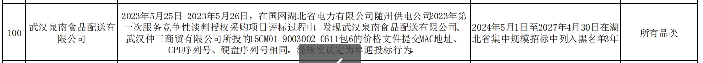 其中,武汉泉南食品配送有限公司在2023年5月25日-2023年5月26日,在国网湖北省电力有限公司随州供电公司2023年第一次服务竞争性谈判授权采购项目评标过程中,发现武汉泉南食品配送有限公司、武汉仲三商贸有限公司所投的15CM01-9003002-0611包6的价格文件提交MAC地址、CPU序列号、硬盘序列号相同。经核实认定为串通投标行为。处理措施:2024年5月1日至2027年4月30日在湖北省集中规模招标中列入黑名单3年。处理范围:所有品类。