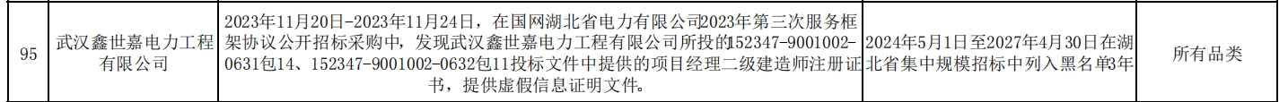 其中,武汉鑫世嘉电力工程有限公司在2023年11月20日-2023年11月24日,在国网湖北省电力有限公司2023年第三次服务框架协议公开招标采购中,发现武汉鑫世嘉电力工程有限公司所投的152347-90010020631包14、152347-9001002-0632包11投标文件中提供的项目经理二级建造师注册证书,提供虚假信息证明文件。处理措施:2024年5月1日至2027年4月30日在湖北省集中规模招标中列入黑名单3年。处理范围:所有品类。