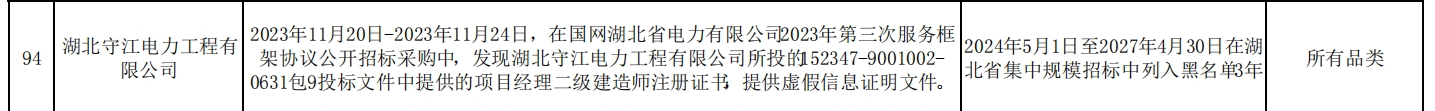 其中,湖北守江电力工程有限公司在2023年11月20日-2023年11月24日,在国网湖北省电力有限公司2023年第三次服务框架协议公开招标采购中,发现湖北守江电力工程有限公司所投的152347-90010020631包9投标文件中提供的项目经理二级建造师注册证书,提供虚假信息证明文件。处理措施:2024年5月1日至2027年4月30日在湖北省集中规模招标中列入黑名单3年。处理范围:所有品类。