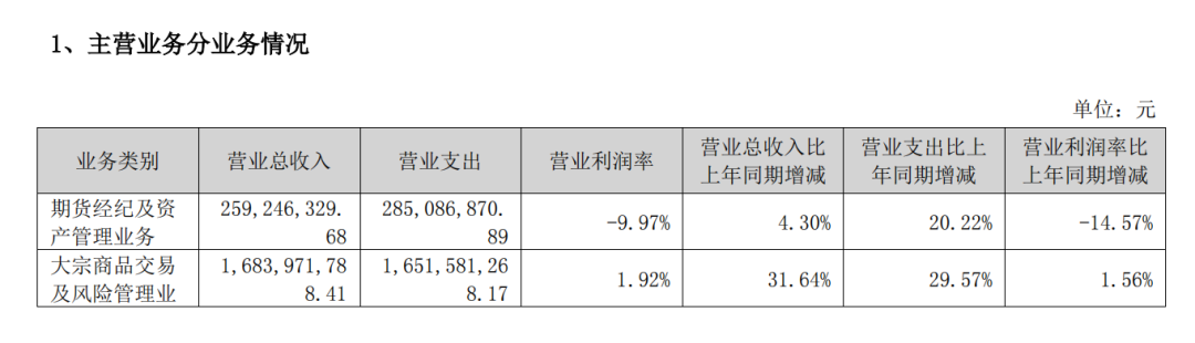 从主营业务情况来看,期货经纪及资产管理业务方面,2023年弘业期货该业务营业总收入为2.59亿元,营业支出为2.85亿元,营业利润率为-9.97%,营业利润率比上年同期下滑14.57%;大宗商品交易及风险管理业务方面,2023年弘业期货该业务营业总收入为16.84亿元,营业支出为16.52亿元,营业利润率为1.92%,营业利润率比上年同期增长1.56%。