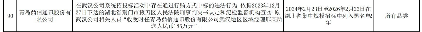 其中,青岛鼎信通讯股份有限公司在武汉公司系统招投标活动中存在通过行贿方式中标的违法行为,依据2023年12月27日下达的湖北省荆门市掇刀区人民法院刑事判决书认定和纪检监督机构查实,原武汉公司相关人员“收受时任青岛鼎信通讯股份有限公司武汉地区区域经理邢某所送人民币185万元”。处理措施:2024年2月23日至2026年2月22日在湖北省集中规模招标中列入黑名单2年。处理范围:所有品类。