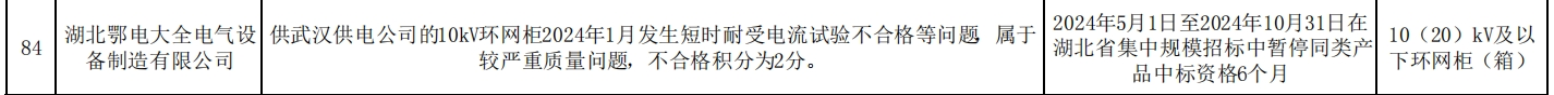 其中,湖北鄂电大全电气设备制造有限公司供武汉供电公司的10kV环网柜2024年1月发生短时耐受电流试验不合格等问题,属于较严重质量问题,不合格积分为2分。处理措施:2024年5月1日至2024年10月31日在湖北省集中规模招标中暂停同类产品中标资格6个月。处理范围:10(20)kV及以下环网柜(箱)。