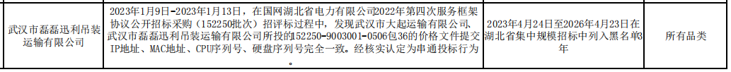 公告显示,武汉市磊磊迅利吊装运输有限公司,2023年1月9日-2023年1月13日,在国网湖北省电力有限公司2022年第四次服务框架协议公开招标采购(152250批次)招评标过程中,发现武汉市大起运输有限公司、 武汉市磊磊迅利吊装运输有限公司所投的152250-9003001-0506包36的价格文件提交 IP地址、MAC地址、CPU序列号、硬盘序列号完全一致。经核实认定为串通投标行为 。