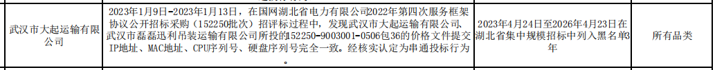 公告显示,武汉市大起运输有限公司,2023年1月9日-2023年1月13日,在国网湖北省电力有限公司2022年第四次服务框架协议公开招标采购(152250批次)招评标过程中,发现武汉市大起运输有限公司、武汉市磊磊迅利吊装运输有限公司所投的152250-9003001-0506包36的价格文件提交 IP地址、MAC地址、CPU序列号、硬盘序列号完全一致。经核实认定为串通投标行为 。