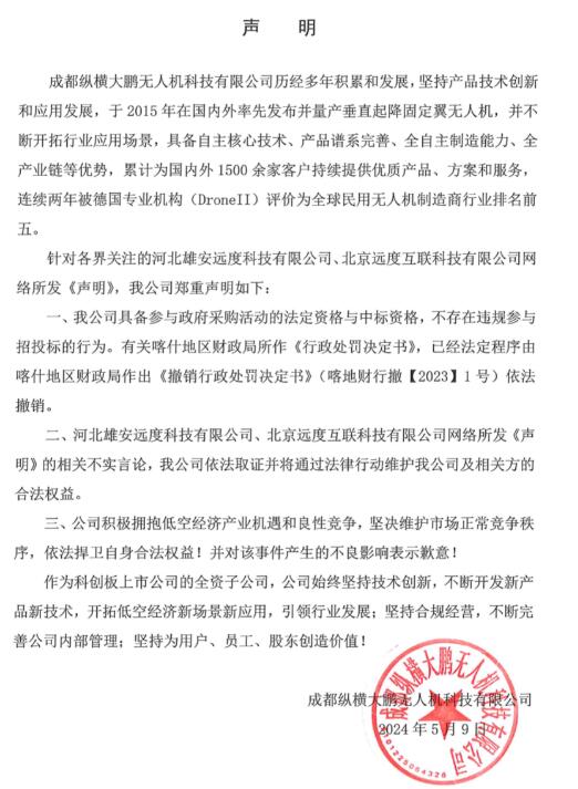 5月9日,纵横股份于公众号发布声明,公司具备参与政府采购活动的法定资格与中标资格,不存在违规参与招投标的行为。