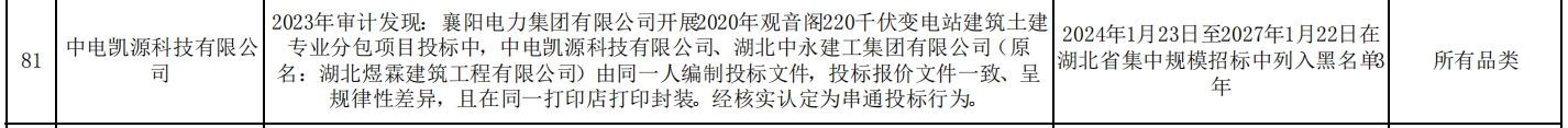 其中,中电凯源科技有限公司在2023年审计中发现,襄阳电力集团有限公司开展2020年观音阁220千伏变电站建筑土建专业分包项目投标中,中电凯源科技有限公司、湖北中永建工集团有限公司(原名:湖北煜霖建筑工程有限公司)由同一人编制投标文件,投标报价文件一致、呈现规律性差异,且在同一打印店打印封装。经核实认定为串通投标行为。处理措施:2024年1月23日至2027年1月22日在湖北省集中规模招标中列入黑名单3年。处理范围:所有品类。