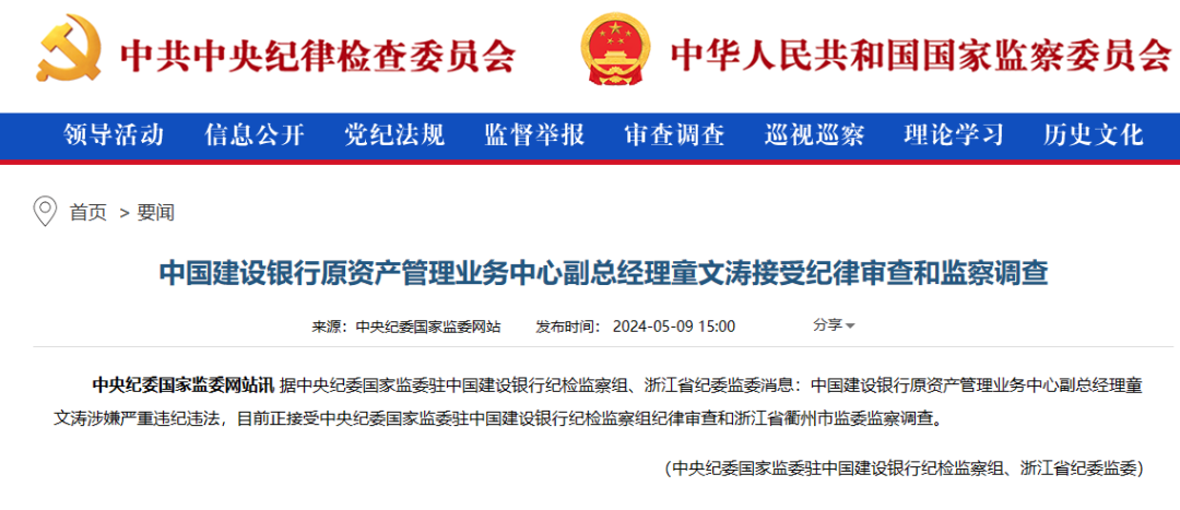 5月9日,中央纪委国家监委官网通报,中国建设银行原资产管理业务中心副总经理童文涛接受纪律审查和监察调查。