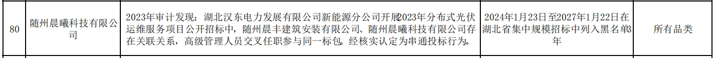 其中,随州晨曦科技有限公司在2023年审计中发现,湖北汉东电力发展有限公司新能源分公司开展2023年分布式光伏运维服务项目公开招标中,随州晨丰建筑安装有限公司、随州晨曦科技有限公司存在关联关系,高级管理人员交叉任职参与同一标包。经核实认定为串通投标行为。处理措施:2024年1月23日至2027年1月22日在湖北省集中规模招标中列入黑名单3年。处理范围:所有品类。