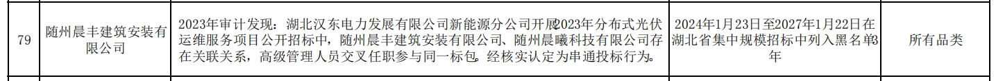 其中,随州晨丰建筑安装有限公司在2023年审计中发现,湖北汉东电力发展有限公司新能源分公司开展2023年分布式光伏运维服务项目公开招标中,随州晨丰建筑安装有限公司、随州晨曦科技有限公司存在关联关系,高级管理人员交叉任职参与同一标包。经核实认定为串通投标行为。处理措施:2024年1月23日至2027年1月22日在湖北省集中规模招标中列入黑名单3年。处理范围:所有品类。