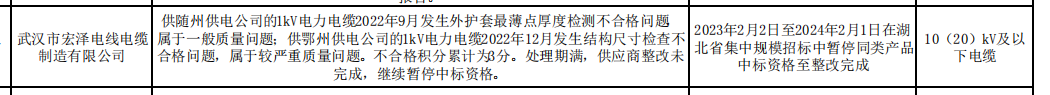 公告显示,武汉市宏泽电线电缆制造有限公司,供随州供电公司的1kV电力电缆2022年9月发生外护套最薄点厚度检测不合格问题, 属于一般质量问题;供鄂州供电公司的1kV电力电缆2022年12月发生结构尺寸检查不 合格问题,属于较严重质量问题。不合格积分累计为3分。处理期满,供应商整改未完成,继续暂停中标资格。