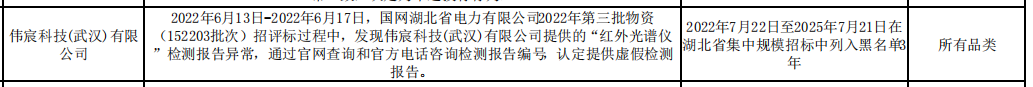 公告显示,伟宸科技(武汉)有限公司,2022年6月13日-2022年6月17日,国网湖北省电力有限公司2022年第三批物资(152203批次)招评标过程中,发现伟宸科技(武汉)有限公司提供的“红外光谱仪 ”检测报告异常,通过官网查询和官方电话咨询检测报告编号,认定提供虚假检测报告。
