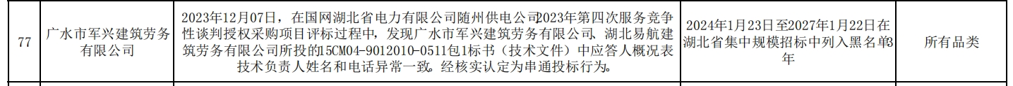 其中,广水市军兴建筑劳务有限公司在2023年12月07日,在国网湖北省电力有限公司随州供电公司2023年第四次服务竞争性谈判授权采购项目评标过程中,发现广水市军兴建筑劳务有限公司、湖北易航建筑劳务有限公司所投的15CM04-9012010-0511包1标书(技术文件)中应答人概况表技术负责人姓名和电话异常一致。经核实认定为串通投标行为。处理措施:2024年1月23日至2027年1月22日在湖北省集中规模招标中列入黑名单3年。处理范围:所有品类。