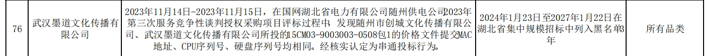 其中,武汉墨道文化传播有限公司在2023年11月14日-2023年11月15日,在国网湖北省电力有限公司随州供电公司2023年第三次服务竞争性谈判授权采购项目评标过程中,发现随州市创城文化传播有限公司、武汉墨道文化传播有限公司所投的15CM03-9003003-0508包1的价格文件提交MAC地址、CPU序列号、硬盘序列号均相同。经核实认定为串通投标行为。处理措施:2024年1月23日至2027年1月22日在湖北省集中规模招标中列入黑名单3年。处理范围:所有品类。