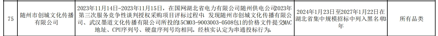 其中,随州市创城文化传播有限公司在2023年11月14日-2023年11月15日,在国网湖北省电力有限公司随州供电公司2023年第三次服务竞争性谈判授权采购项目评标过程中,发现随州市创城文化传播有限公司、武汉墨道文化传播有限公司所投的15CM03-9003003-0508包1的价格文件提交MAC地址、CPU序列号、硬盘序列号均相同。经核实认定为串通投标行为。处理措施:2024年1月23日至2027年1月22日在湖北省集中规模招标中列入黑名单3年。处理范围:所有品类。