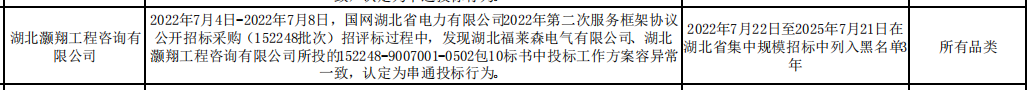 公告显示,湖北灏翔工程咨询有限公司,2022年7月4日-2022年7月8日,国网湖北省电力有限公司2022年第二次服务框架协议公开招标采购(152248批次)招评标过程中,发现湖北福莱森电气有限公司、湖北灏翔工程咨询有限公司所投的152248-9007001-0502包10标书中投标工作方案容异常一致,认定为串通投标行为。