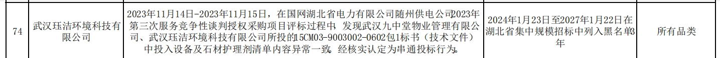 其中,武汉珏洁环境科技有限公司在2023年11月14日-2023年11月15日,在国网湖北省电力有限公司随州供电公司2023年第三次服务竞争性谈判授权采购项目评标过程中,发现武汉九中堂物业管理有限公司、武汉珏洁环境科技有限公司所投的15CM03-9003002-0602包1标书(技术文件)中投入设备及石材护理剂清单内容异常一致。经核实认定为串通投标行为。处理措施:2024年1月23日至2027年1月22日在湖北省集中规模招标中列入黑名单3年。处理范围:所有品类。
