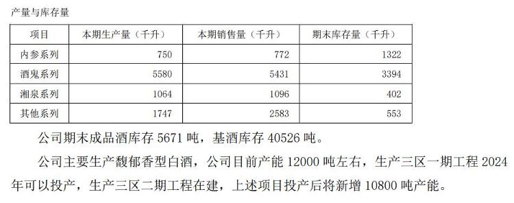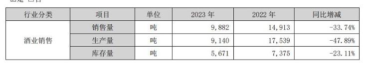 酒鬼酒2023年报销售量、生产量、库存量变化数据。