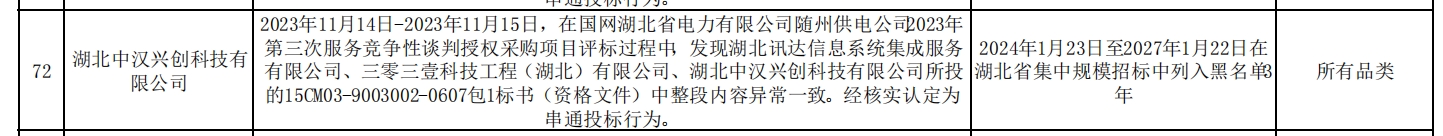 其中,湖北中汉兴创科技有限公司在2023年11月14日-2023年11月15日,在国网湖北省电力有限公司随州供电公司2023年第三次服务竞争性谈判授权采购项目评标过程中,发现湖北讯达信息系统集成服务有限公司、三零三壹科技工程(湖北)有限公司、湖北中汉兴创科技有限公司所投的15CM03-9003002-0607包1标书(资格文件)中整段内容异常一致。经核实认定为串通投标行为。处理措施:2024年1月23日至2027年1月22日在湖北省集中规模招标中列入黑名单3年。处理范围:所有品类。