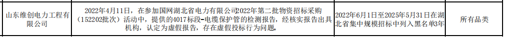 公告显示,山东维创电力工程有限公司,2022年4月11日,在参加国网湖北省电力有限公司2022年第二批物资招标采购 (152202批次)活动中,提供的4017标段-电缆保护管的检测报告,经核实报告出具机构,认定为虚假报告,存在虚假投标行为问题。