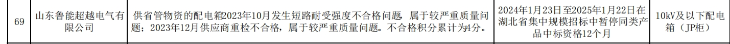 其中,山东鲁能超越电气有限公司因供省管物资的配电箱2023年10月发生短路耐受强度不合格问题,属于较严重质量问题;2023年12月供应商重检不合格,属于较严重质量问题。不合格积分累计为4分。处理措施:2024年1月23日至2025年1月22日在湖北省集中规模招标中暂停同类产品中标资格12个月。处理范围:10kV及以下配电箱(JP柜)。