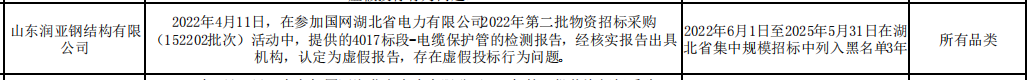 公告显示,山东润亚钢结构有限公司,2022年4月11日,在参加国网湖北省电力有限公司2022年第二批物资招标采购 (152202批次)活动中,提供的4017标段-电缆保护管的检测报告,经核实报告出具机构,认定为虚假报告,存在虚假投标行为问题。